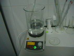Se introduc 16 +- 0.5 ml de acid clorhidric intr-un pahar de laborator de 3 litri continand 2 litri de apa de la robinet incalzita la +46, +48 grade Celsius, se plaseaza o bara magnetica in paharul de laborator, se pune paharul pe placa preincalzita si se demareaza agitarea.