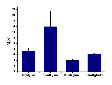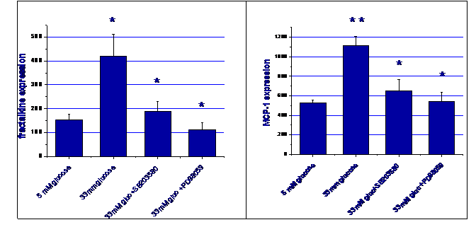 In cazul celulelor endoteliale concentratia crescuta de glucoza a indus expresia genica si proteica a MCP-1. Similar, in cazul CMN activate de glucoza crescuta, expresiile genice ale ambelor chemokine studiate, MCP-1 si fractalkina sunt crescute (figura 1). Dupa cum observam, in celulele expuse concentratiei normale de glucoza, MCP-1 este exprimata la nivel foarte scazut, iar fractalkina nu este exprimata. Expresia genica a MCP-1 este crescuta proportional cu cresterea concentratiei de glucoza, fiind maxima la 33mM glucoza. In cazul fractalkinei, desi obtinem crestere de expresie la 25mM, o crestere semnificativa se observa doar la 33mM glucoza.