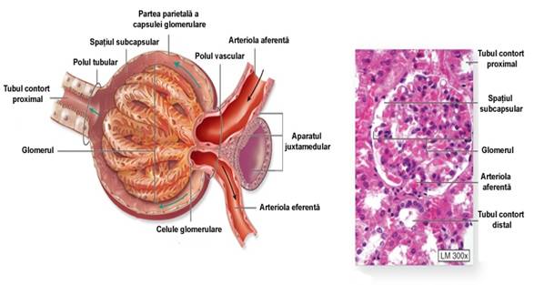 a)Glomerulul este reprezentat printr-un ghem de capilare sanguine arteriale, provenite dintr-o arteriola aferenta detasata de pe artera interlobulara.