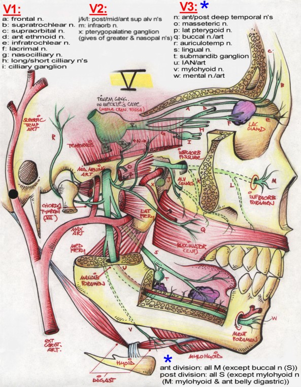 - apoi, aceste 2 ramuri se intrepatrund si formeaza un singur trunchi nervos la intrarea in fosa infratemporala;
