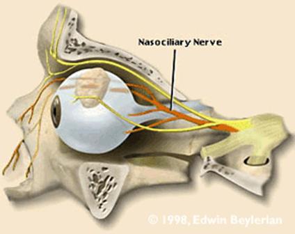 1. nervul etmoidal anterior - patrunde in cavitatea nazala si devine nervul nazal anterior care se imparte in: