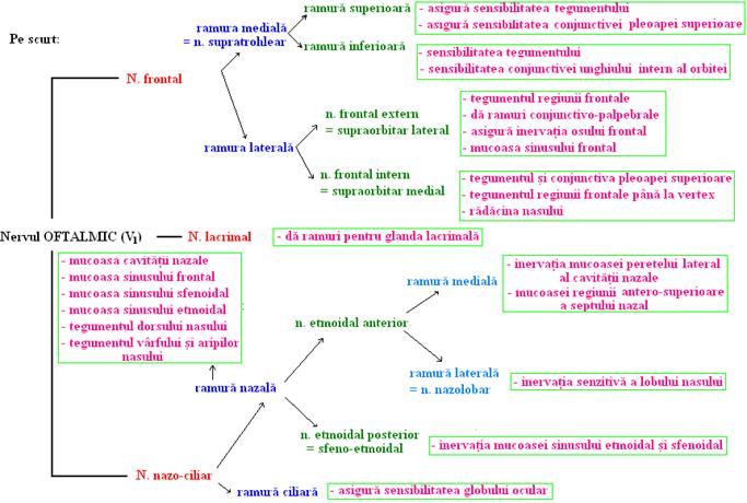 inaintea iesirii din craniu prin fisura orbitara superioara se imparte in 3 ramuri terminale: