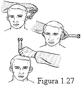 -proba Rinne (figura 1.27): diapazonul se asaza pe mastoida, pana cand nu se mai percep vibratiile si apoi in dreptul urechii, sunetul fiind perceput pentru inca 20-30 secunde (Rinne pozitiv-normal). In surditatea de transmisie proba Rinne este negativa prin diminuarea transmisiei aeriene.