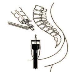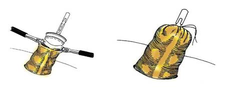 Fig. 7 - Restabilirea continuitatii dupa operatia Hartmann laparoscopica: dupa eliberarea colostomiei se introduce o nicovala a unui stapler circular pe axul careia se strange firul de bursa (7)