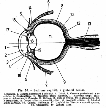 Din punct de vedere anatomic, ochiul este, dupa cum se stie, un organ deosebit de complex, servind la transformarea imaginilor geometrice ale corpurilor in senzatii vizuale. Privind insa numai din punctul de vedere al opticii geometrice, el constituie un sistem optic format din trei medii transparente: umoarea apoasa, cristalinul si umoarea sticloasa (sau vitroasa), aceastea se gasesc in interiorul globului ocular, marginit in exterior de o membrana rezistenta, numita sclerotica. Sclerotica este opaca peste tot, exceptand o portiune din fata, care este transparenta si de forma sferica, numita corneea transparenta. Lumina patrunde in ochi prin cornee, strabate cele trei medii transparente si cade pe retina, unde se formeaza o imagine reala si rasturnata a obiectelor privite. Fluxul luminos este reglat automat prin actiunea involuntara (reflexa) a irisului. Aceasta este o membrana (ai carei pigmenti dau "culoarea ochilor") perforata in centru printr-o deschidere circulara, de diametrul variabil, numita pupila. La lumina prea intensa, irisul isi mareste pupila, penru a proteja retina, iar la lumina prea slaba, irisul isi mareste pupila pentru a mari iluminarea imaginilor de pe retina. Retina este o membrana subtire, alcatuita din prelungirile nervului optic si continand un numar mare de celule senzationale, care percep lumina, numite conuri si bastonase. Conurile sunt celule specializate in perceperea luminii de intensitate slaba, fiind practic incapabile sa distinga culorile. Ochiul omenesc contine aproximativ 7 milioane conuri si 130 milioane bastonase, foarte neuniform raspandite. Conurile ocupa mai ales partea centrala a retinei, in timp ce densitatea bastonaselor creste spre periferie. In partea centrala, putin mai sus de axa optica, exista o regiune numita pata galbena (macula lutea) in mijlocul careia se afla o mica adancitura - foveea centralis - populata exclusiv de conuri, in numar de 13000 - 15000. Sub actiunea involuntara a unor muschi speciali ai ochilului, globul ocular sufera miscari de rotatie in orbita sa, astfel incat imaginea sa se formeze totdeauna in regiunea petei galbene, cea mai importanta regiune fotosensibila a ochiului.Cristalinul are forma unei lentile nesimetric biconvexe si poate fi mai bombat sau mai putin bombat sub actiunea reflexa a muschilor ciliari, modificandu-si astfel convergenta, incat imaginea sa cada pa retina. El are o structura stratificata, prezentand spre margine indicele de refractie de aproximativ 1,38 , iar in interior de aproximativ 1,41.