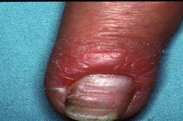 Tegumentul care inconjoara unghia este infiltrat ,rosu ,formand un chenar inflamator .Uneori prin presiune se exprima 1-2 picaturi mici de puroi .Evolutia e cronica cu ameliorari si izbucniri succesive .
