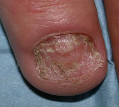 Fragmente din partea ei distala se detaseaza ,ceea ce face ca lungimea unghiei sa apara net diminuata .Cateodata tabla se exfoliaza aproape in intregime si in locul ei se vede patul unghial ,poros ,noduros , cu portiuni in relief alternand cu adancituri ,de culoare cenusie-negricioasa prin impregnare cu praf .O caracteristica importanta pentru diagnostic : o infectie unghiala cu dermatofiti nu se insoteste de perionixis si nici de fenomene dureroase ,ceea ce o deosebeste de onicomicozele provocate de Candida .