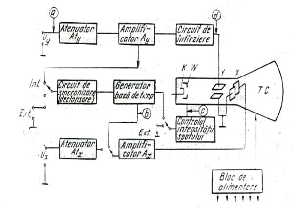 de timp, circuitul de sincronizare , circuitul pentru controlul intensitatii spotului, circuitul de intarziere si blocul de alimentare.