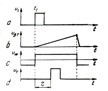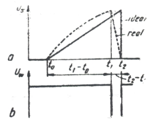 La t=t1 baza de timp se declanseaza genereaza un dinte de ferastrau si apoi se blocheaza din nou (figura 2, b).
