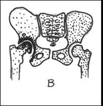 in unele cazuri procesele distructive sunt mai grave, disparand complet capul femural si realizand imaginea de "pseudartroza intracotiloidiana Menard";