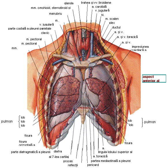 Cutia toracica adaposteste pulmonii si mediastinul cu viscerele continute de acesta. Mediastinul, ce se intinde de la coloana vertebrala pana la stern si de la apertura toracica superioara pana la diafragm (cupola diafragmatica este boltita si urca in cavitatea toracica pana in dreptul vertebrei T7), imparte cavitatea toracica in 3 spatii: un spatiu central, mediastinal, ce contine alaturi de alte structuri inima invelita in seroasa pericardica, si doua spatii laterale, drept si stang, ce contin cei doi plamani acoperiti fiecare de catre o seroasa pleurala care captuseste jumatatea corespunzatoare a toracelui si formeaza in plus limita laterala a spatiului mediastinal.