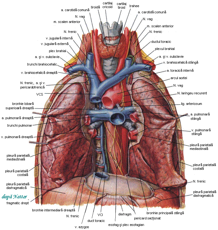 - mediastin mijlociu: cuprinde inima si pericardul, bifurcatia traheei si bronhiile prin-cipale, aorta ascendenta, trunchiul pulmonar si a. pulmonare dreapta si stanga, partea intrapericardica a VCS, v. azygos, venele pulmonare drepte si stangi, Nn. fre-nici, limfonodulii traheo-bronsici si plexul cardiac;