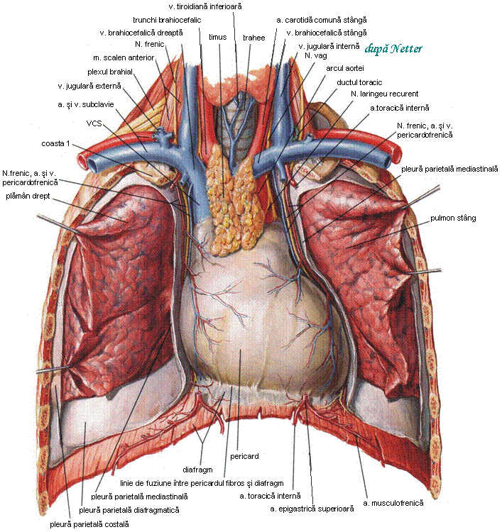 - mediastin anterior: situat intre stern si pericard, contine ligamentele sterno-pericar-dice, ramurile a. toracice (mamare) interne, timusul, tesut conjunctiv lax;