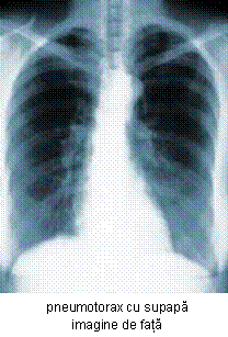 Pneumotoraxul in tensiune (cu supapa, sufocant, compresiv): mecanismul sau de dezvoltare nu este intotdeauna evident; durerea poate fi primul simptom, fara dificultate in respiratie; pe masura ce trauma pulmonara se manifesta ca o supapa, aerul patrunde treptat in cavitatea pleurala la fiecare inspir sau fiecare accces de tuse si nu se mai evacueaza in expir presiunea intrapleurala creste, plamanul se colabeaza si se dezvolta pneumo-toraxul in tensiune; mobilizarea mediastinului cu presiune pe venele mari duce la in-suficienta cardiaca si moarte subita.