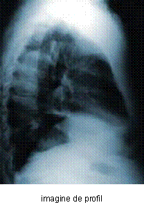 imaginea opaca cu membrana retensionata, imagine de pneumotorax cu opacitate ovalara in fundul de sac posterior sau de hidropneumotorax in cazul rupturii chistului in cavitatea pleurala;