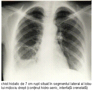 - examenul radiologic in chistul hidatic necomplicat: apare opacitate rotunda sau ova-lara, bine delimitata (ca trasa cu compasul), de intensitate subcostala; in cazul chis-telor gigante, datorita atelectaziei tesutului pulmonar inconjurator, imaginea pierde conturul net; un semn radiologic patognomonic este "respiratia echinococului" (alungirea opacitatii in inspir profund si turtirea sa in expir);