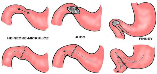 Interventiile chirurgicale asupra pilorului sunt pilorotomii piloroplastice (Heinecke-Mikulicz) si pilorectomii piloroplastice (antropiloroduodenectomie anterioara tip Starr-Judd, piloroplastia Finney) (Fig. 1). Suprimarea completa a pilorului se realizeaza si prin bulbantrectomie sau hemigastrectomie.