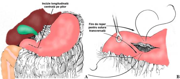 In caz de deformare a regiunii, incizia incepe pe duoden; se trece o pensa prin pilorul stenozat, care serveste de ghid, pe care se practica sectiunea portiunii mijlocii a pilorului si a fetei anterioare a stomacului. Eventuala sangerare se controleaza prin aplicarea unor pense de hemostaza si ligatura cu fir 4-0. Se exploreaza intralumenal antrul gastric si duodenul. Tractiunea exercitata pe firele angulare expune incizia longitudinala facilitand sutura transversala.