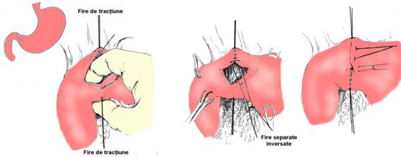 Patura submucoasa posterioara, dintre stomac si duoden este suturata cu fire separate de ata 4-0. Acest plan posterior se efectueaza pornind de la unghiul superior si poate fi un plan total. Peretele anterior este suturat cu puncte inversante de ata 4-0. Pe peretele anterior se efectueaza un al doilea plan cu fire capitonante seromusculare. Sutura poate fi acoperita cu epiploon.