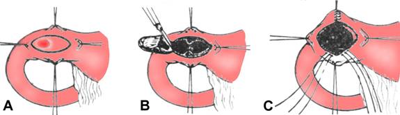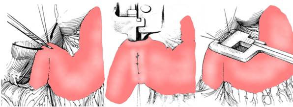 Fig. 4 - Piloroplastie Judd-Starr: a - excizie pilorica ovalara, orizontala, ingloband ulcerul; b -pilorul centreaza elipsa rezultata, situata la egala distanta de marginile duodenului; c - sutura verticala cu fire separate