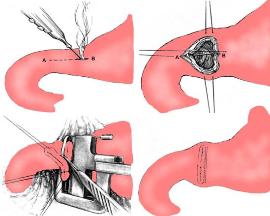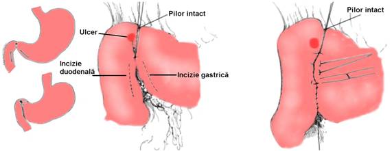 Peretele gastric si duodenal sunt apropiate cu fire separate 2-0, trecute cat mai aproape de marea curbura gastrica si marginea interna a duodenului. Se practica o incizie in U pe peretele gastric incepand de la firul de reper inferior pana la nivelul pilorului pe care-l sectioneaza si coborand pe duoden adiacent liniei de sutura. Se mai poate efectua cate o incizie de o parte si de alta a pilorului, care apoi se reunesc intr-o potcoava cu deschidere caudala (Fig. 5). Un eventual ulcer anterior poate fi excizat. Se realizeaza hemostaza prin pensarea si ligaturarea cu fir 4-0 a vaselor din submucoasa. Se poate exciza sfincterul piloric de fiecare parte.