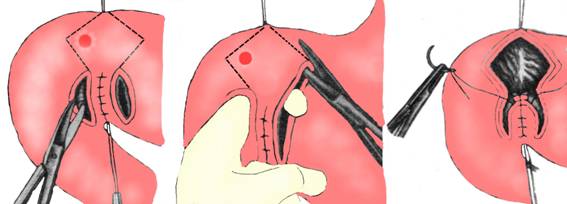 Se repereaza pilorul cu fire plasate catre marginile canalului piloric, se excizeaza din peretele anterior piloro-duodenal o rondela elipsoida sau rombica, cu marele ax longitudinal, incluzand si leziunea ulceroasa. Se efectueaza sutura piloroplastica transversala cu fire separate totale, astfel incat extremitatile axului lung (punctele cele mai indepartate ale sectiunii) devin punctul mijlociu al suturii (punctul de maxima tensiune) (Fig. 4).