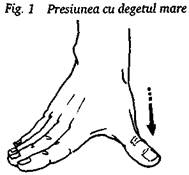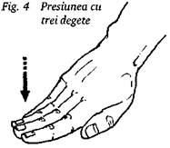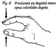 In general, degetul mare al mainii drepte se afla dedesubt, iar cel al mainii stangi deasupra, apasandu-i unghia. Celelalte patru degete ale fiecarei maini servesc drept sprijin usor. Presiunea se exercita cu ambele degete mari simultan (fig. 3). Se foloseste atunci cand este necesara o presiune mai puternica - pentru tratamentul spatelui, al picioarelor si talpilor.
