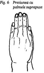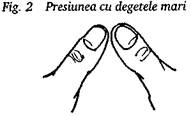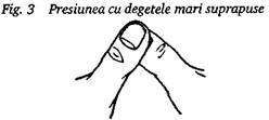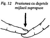 Toate degetele, cu exceptia celor mijlocii ale ambelor maini, sunt apropiate. Varful unui deget mijlociu se aseaza peste unghia celuilalt. Presiunea este aplicata cu buriccele ambelor degete (fig. 12).
