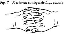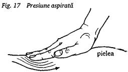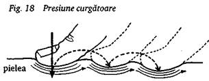 Acest gen de presiune se face ritmic, curgator, fie inainte si inapoi, fie la dreapta si la stanga, de la un punct la altul, utilizandu-se fie palma, fie degetele (fig. 18). Fiecare apasare dureaza intre una si doua secunde.