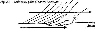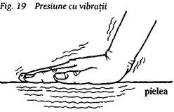 Mai multe vibratii de mica frecventa si foarte mica presiune sunt aplicate pe corpul pacientului prin asezarea usoara a degetelor (sau a palmei) pe piele si deplasarea lor lenta inainte si inapoi (fig. 19). Aceasta tehnica se caracterizeaza printr-o senzatie placuta si prin profunzimea efectelor ei.