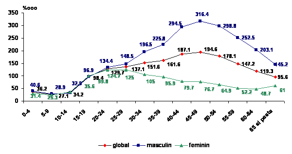 In Romania, ca de altfel in intreaga lume, cazurile de imbolnavire la barbati sunt de 2,1 ori mai frecvente decat cele la femei. Repartitia pe grupe de varste indica diferente intre cele doua sexe: cele mai multe imbolnaviri apar la barbati la varste adulte, intre 40 si 54 de ani, iar la femei la varste mai tinere, intre 20 si 34 de ani (Figura 3). Aceasta observatie conduce la concluzia ca transmiterea infectiei in populatie nu este deocamdata pe deplin controlata.