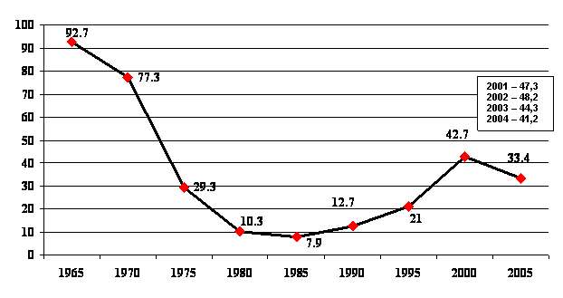 Figura 5: Evolutia mortalitatii prin TB in Romania