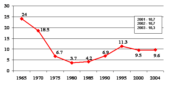 In ceea ce priveste TB, in Romania, in ultima perioada au fost raportate aproximativ 30.000 de cazuri noi si recidive anual. Incidenta globala a bolii a avut dupa anul 1985 o evolutie constant ascendenta, ajungand in anul 2002 la valoarea maxima de 142,2%ooo. In anii urmatori s-a inregistrat o tendinta de stabilizare si chiar de usoara scadere a valorilor acestui indicator (Figura 1).