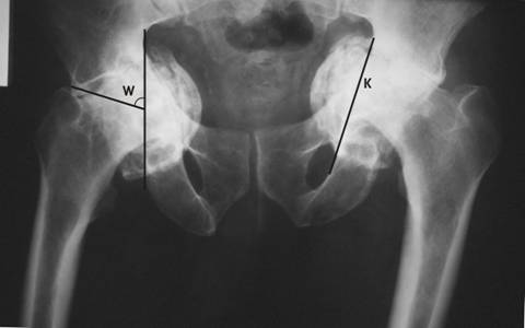 unghiul Wiberg (W), iar pe cel stang linia ilio-ischiatica Kohler (K).