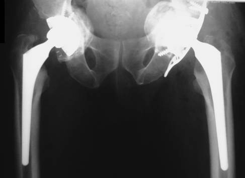 Artroplastiile s-au realizat in doua interventii operatorii la distanta de 6 luni, initial pe partea dreapta (fig. 2), unde s-a instalat initial decompensarea algica si apoi pe partea stanga (fig. 3), unde a fost necesara crearea unui nou fund al acetabulului cu ajutorul unui inel de ranforsare insurubat tip Brch-Schneider. Intre inel si acetabul s-a introdus o grefa osoasa cortico-spongioasa recoltata din creasta iliaca. Pe ambele parti, componenta femurala a fost de tip necimentat.