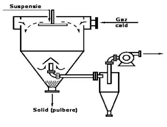 un disc care se invarte cu viteza inalta 6 000 - 10 000 turatii/min. ce transforma produsul lichid dispersat sub forma de nor fin de particule, iar acesta este uscat de un curent de aer cald care circula de jos in sus;