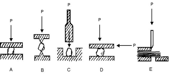 Maruntirea poate fi exprimata prin patru metode principale: strivire (A), taiere sau despicare (B, E), lovire (C) si frecare (D) (fig. 7). Operatia nu este foarte simpla si in majoritatea cazurilor fortele actioneaza combinat strivirea cu frecarea, lovirea cu strivirea si frecarea, despicarea, lovirea si frecarea etc.