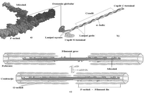 In muschi, miozina este asociata actinei (Mr 42 kDa), proteina ce se gaseste insa in aproape toate celulele eucariote (Fig.11a). Moleculele de G-actina (actina globulara) se agrega si formeaza F-actina (actina filamentoasa) care, impreuna cu tropomiozina si troponina constituie filamentele fine. Si la nivelul acestor filamente exista un situs de legare si hidroliza a ATP cu rol in asamblarea filamentului.