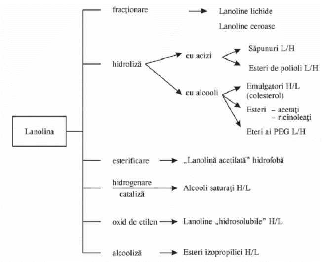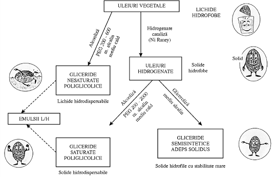 Astfel, dependent de prezenta sau nu a apei, pot fi: unguente (geluri lipofile), unguente-emulsii de tipul H/L sau creme de tipul H/L. Daca agentul gelifiant este intr-o proportie mica se pot obtine si forme fluide (lotiuni).