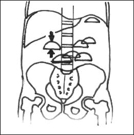 centrat la nivele cum sunt spatiul subfrenic la un pacient in pozitie ortostatica sau la nivelul portiunii cele mai inalte a cavitatii abdominale;
