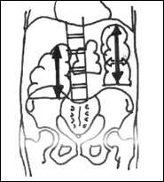 volume mai mari de 1 litru deplaseaza ansele intestinale cu continut aerian centrat in abdomen, obliterand contururile grasoase ale rinichiului si muschiului psoas;