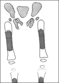 intre nucleii epifizari si diafiza se afla cartilajul de crestere, reprezentat radiografic de o zona transparenta avind cele doua contururi(superior si inferior) neregulate si care isi reduce grosimea treptat pe masura ce se termina procesul de crestere in lungime, osificindu-se in final;