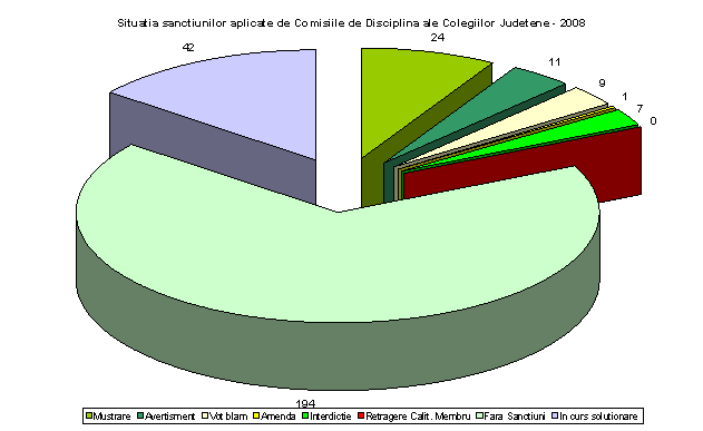 In anul 2008 Comisiile de Disciplina ale Colegiilor Judetene au analizat pana la data de 1 septembrie 288 dosare. Sanctiunile aplicate sunt ilustrate in graficul urmator.
