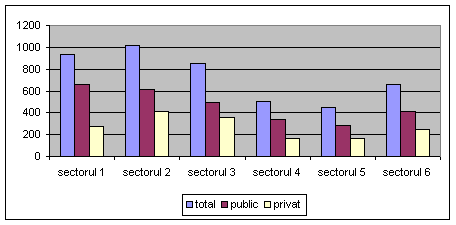 Decalaje se inregistreaza si in repartitia spatiala a unitatilor sanitare pe sectoare. Aceste diferentieri arata ca sectoarele fruntase sunt 2, 1 si 3. La polul opus, sectoarele deficitare, in ceea ce priveste distributia unitatilor sanitare, sunt 6, 4 si 5.