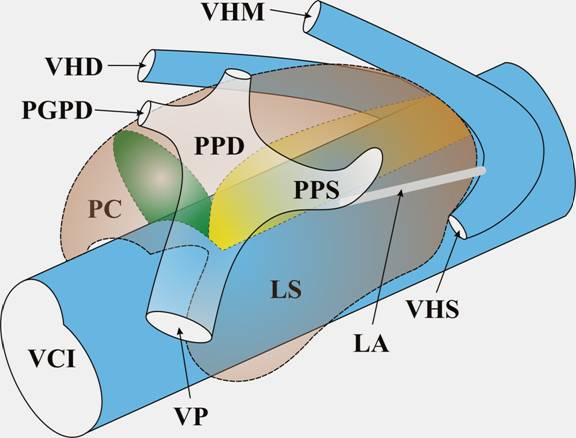 Figura 2. Delimitarea LC in raport cu pediculii glissonieni si venele hepatice. PPD - pediculul portal drept; PPS - pediculul portal stang; PGPD - pediculul glissonian posterior drept; VHD - vena hepatica dreapta; HVM - vena hepatica medie; VHS - vena hepatica stanga; VCI - vena cava inferioara. |