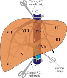 Disectia parenchimului poate beneficia de excluderea vasculara totala, hemostaza fiind completata inaintea declampajului.