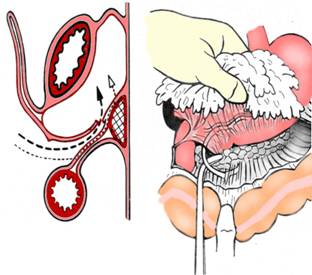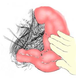 Se identifica prima ansa jejunala si se deschide mezocolonul transvers. Pentru aceasta, se basculeaza in sus marele epiploon si colonul transvers si, cu mana dreapta, se urmareste fata inferioara a mezocolonului pana la flancul stang al coloanei vertebrale si se prinde prima ansa jejunala imediat sub radacina mezocolonului. Se evidentiaza si se examineaza mezocolonul transvers prin transparenta; se practica o bresa verticala de 8 cm in mezocolon, la stanga liniei mediane, intr-o zona avasculara (la stanga arterei colice medii), bresa care se repereaza la cele doua extremitati cu doua pense Kocher pozitionate prin etajul supramezocolic. Se trece ansa jejunala prin bresa, iar colonul si epiploonul sunt reintegrate in abdomen.