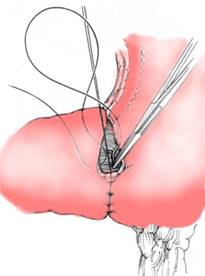 Anastomoza gastro-duodenala incepe cu peretele posterior, de jos in sus sau de sus in jos sau de la mijloc, in functie de situatia locala. Firele se trec extramucos si se innoada, de preferinta, in afara lumenului. Se continua cu inchiderea transei anterioare intre firele comisurale tractoare care vor fi innodate in afara lumenului (Fig. 4). Comisura superioara a anastomozei se intareste cu un fir in U tip Mayo. Se controleaza etanseitatea suturii si digital permeabilitatea gurii. Epiploonul gastr-ocolic se poate ancora la marea curbura.