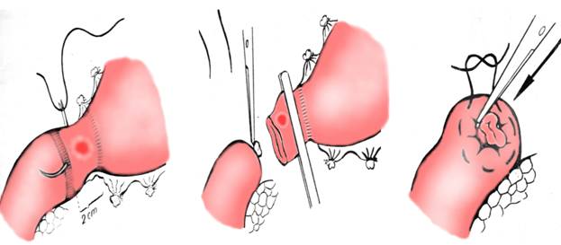 Urmeaza inchiderea transei gastrice incepand de la mica curbura, pana obtinem lumenul gastric necesar anastomozei cu duodenul. Inchiderea transei gastrice poate fi executata in doua planuri (surjet de catgut, urmat de fire separate seromusculoase trecute la 5 mm distanta).
