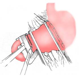 Se fixeaza marginea dreapta a bresei mezocolice la fata posterioara a stomacului. Cu stomacul rasturnat pe rebord, se fixeaza unghiul posterior al bresei la mica curbura, sub ligatura vaselor coronare si unghiul anterior la marea curbura. Intre ele se mai trec fire, apoi se taie toate firele se taie.